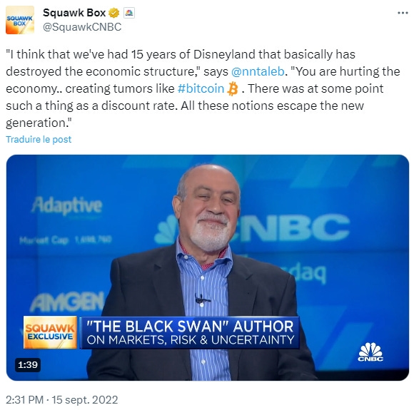 *** protection patrimoniale s’appuyant sur le fameux concept de réserve de valeur. Je vous propose cet extrait d’une émission récente sur BFM où Jonathan Herscovici, dirigeant de StakinSats, nous offre une belle pirouette en expliquant que Bitcoin devrait s’apprécier lorsque les (vilaines) banques centrales redéployeront de la création monétaire. Bitcoin redeviendra alors un rempart (hedge) idéal contre l’inflation systématique qui découle de l’impression monétaire (sic). Alors que comme l’explique Taleb c’est l’abondance de cash dans un monde où l’argent ne coûtait rien (taux d’intérêt bas des années 2010-2020) qui a permis l’abondement dans la piscine des cryptos. C’est à voir ici
